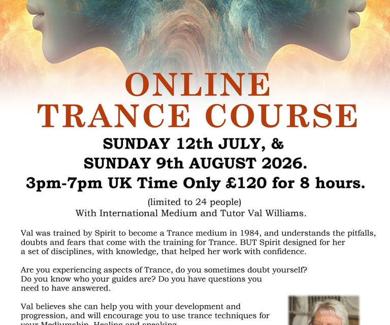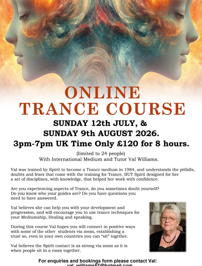 Val was trained by Spirit to become a Trance medium in 1984, and understands the pitfalls, doubts and fears that come with the training for trance. BUT spirit designed for her a set of disciplines, with knowledge, that helped he work with confidence.